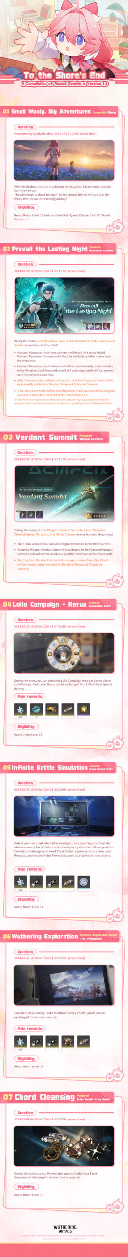 Here is a compilation of the upcoming events in Version 1.3. Don't forget to check it out! WutheringWaves.gg Articles: 1460 Previous Post Post-Lament Anthropocene: Stars Intertwined | Youhu Next Post [Bountiful Crescendo] Limited-Time Material Double Drop Event More Articles Notice on the Upgrade and Maintenance of the [Reprise of Tides] Returnee EventDecember 4, 2025 Pusoy Go Download Sparks Dialogue Among GameZone PlayersDecember 2, 2025 Post-Lament Anthropocene: Comprehensive Mirror for Historians—Lahai-RoiNovember 30, 2025 [Tactical Simulacra: Off Tune] Featured Combat EventNovember 26, 2025 V2.8 Wuthering Waves Battle RushNovember 20, 2025 Wuthering Waves Fan Creation Event “To the City Set in Amber” is now live!November 20, 2025 Wuthering Waves Fan Creation Event Winners RevealNovember 20, 2025 Patch Notes for Version 2.8: To the City Set in AmberNovember 20, 2025