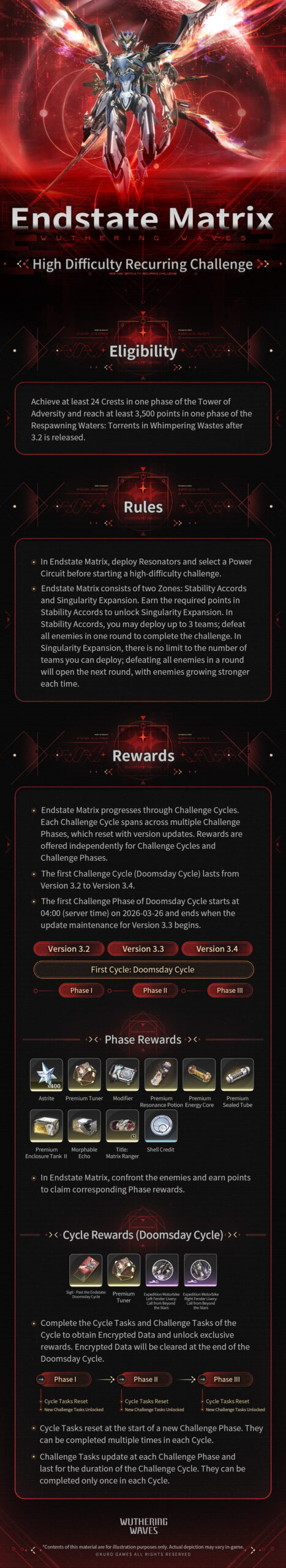 Endstate Matrix progresses through Challenge Cycles. Each Challenge Cycle spans across multiple Challenge Phases. Get a sneak peek now! WutheringWaves.gg Articles: 1572 Previous Post [Chord Cleansing] Limited-Time Echo Double Drop Event Next Post Wuthering Waves Version Preview | Version 3.2 "Resolution to Illuminate the Shadows" Scheduled for Release on March 19th (UTC+8) More Articles Wuthering Waves Version Preview | Version 3.2 “Resolution to Illuminate the Shadows” Scheduled for Release on March 19th (UTC+8)March 13, 2026 [Chord Cleansing] Limited-Time Echo Double Drop EventMarch 10, 2026 [Lollo Campaign: Implementation] Featured Commission EventMarch 4, 2026 GameZone Rebate Framework: Strategic Cashback Integration for Pacquiao-Themed Bingo and Color GameMarch 2, 2026 [Lux & Umbra] Featured Weapon ConveneFebruary 25, 2026 [From Ashes] Featured Resonator ConveneFebruary 25, 2026 [When Winter Thaws] Featured Resonator ConveneFebruary 25, 2026 [Daybreaker’s Spine] Featured Weapon ConveneFebruary 25, 2026