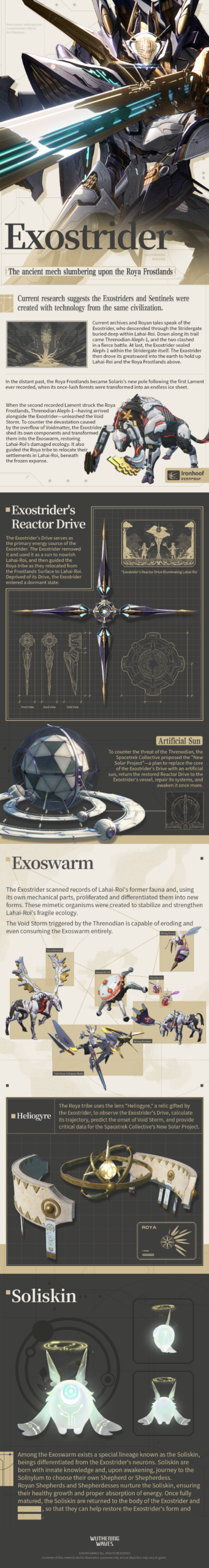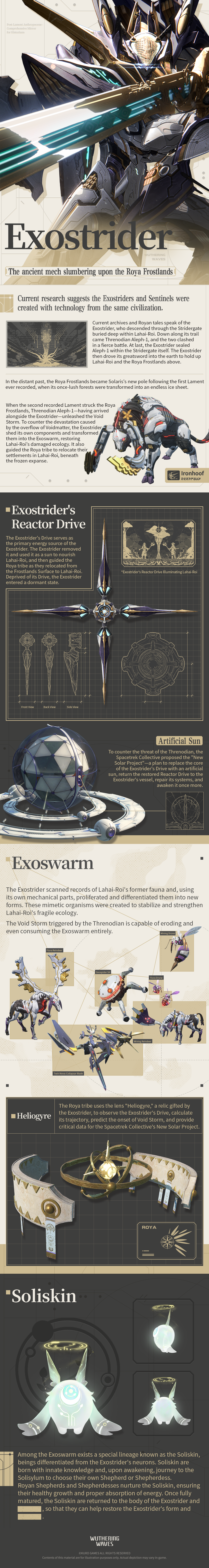 Current archives and Royan tales speak of the Exostrider, who descended through the Stridergate buried deep within Lahai-Roi. Down along its trail came Threnodian Aleph-1, and the two clashed in a fierce battle. At last, the Exostrider sealed Aleph-1 within the Stridergate itself. The Exostrider then drove its greatsword into the earth to hold up Lahai-Roi and the Roya Frostlands above.