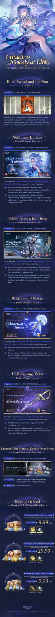 Here is a compilation of the upcoming events in Version 2.5. Don't miss out! WutheringWaves.gg Articles: 1462 Previous Post [Overflowing Picture Book] Leisure Event Next Post [Absolute Pulsation] Featured Weapon Convene: Boosted Drop Rate for Whispers of Sirens More Articles Post-Lament Anthropocene: Stars Intertwined | BulingDecember 7, 2025 [Lollo Campaign: Rising Anew] Featured Commission EventDecember 7, 2025 Notice on the Upgrade and Maintenance of the [Reprise of Tides] Returnee EventDecember 4, 2025 Pusoy Go Download Sparks Dialogue Among GameZone PlayersDecember 2, 2025 Post-Lament Anthropocene: Comprehensive Mirror for Historians—Lahai-RoiNovember 30, 2025 [Tactical Simulacra: Off Tune] Featured Combat EventNovember 26, 2025 V2.8 Wuthering Waves Battle RushNovember 20, 2025 Wuthering Waves Fan Creation Event “To the City Set in Amber” is now live!November 20, 2025