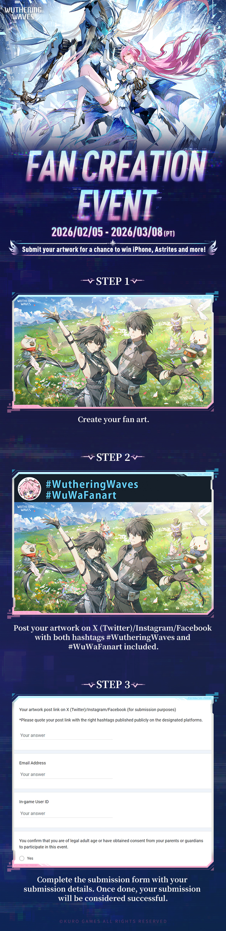 1. To qualify for participation, you should include both hashtags #WutheringWaves and #WuWaFanart in your post and fill out the submission form.